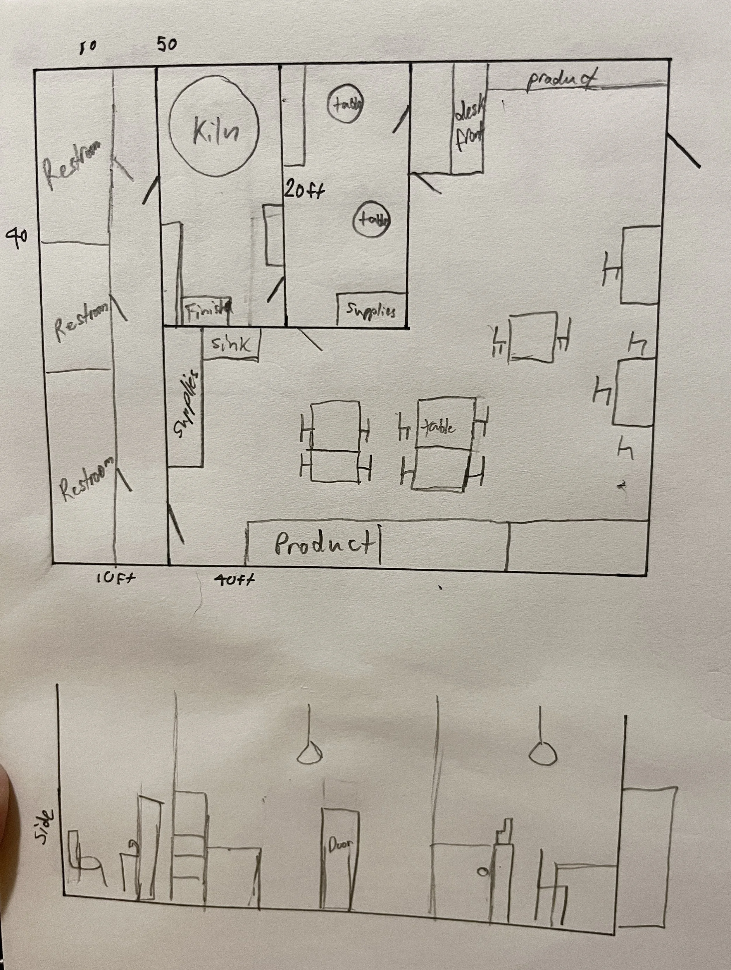 A 400 sq. ft. employee-only workspace designated for pottery firing, storage, and a staff break room.
